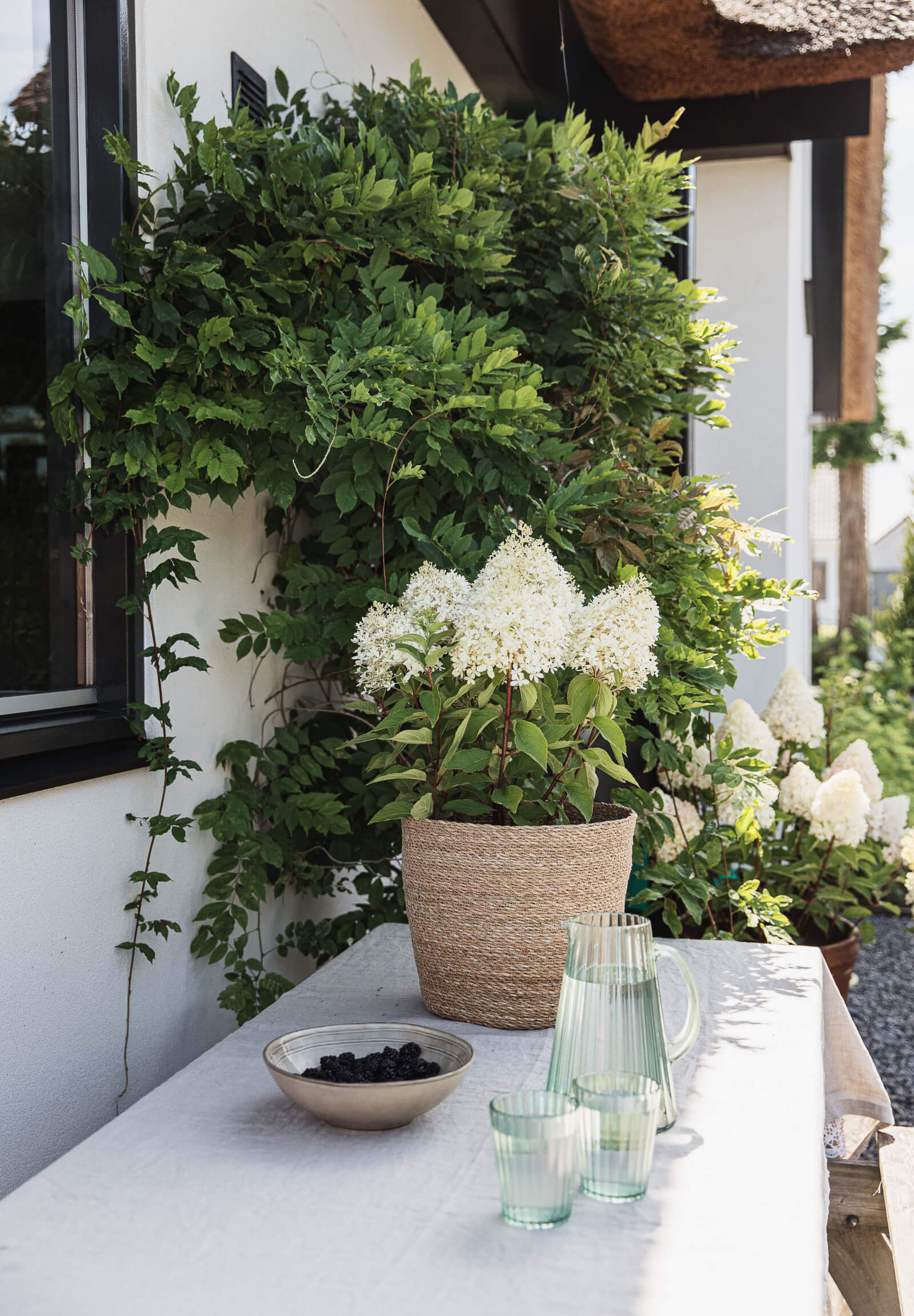 Ik ben een sterke pluimhortensia met zeer grote, witte bloemen. Aan het einde van het seizoen verkleuren die naar zachtroze.